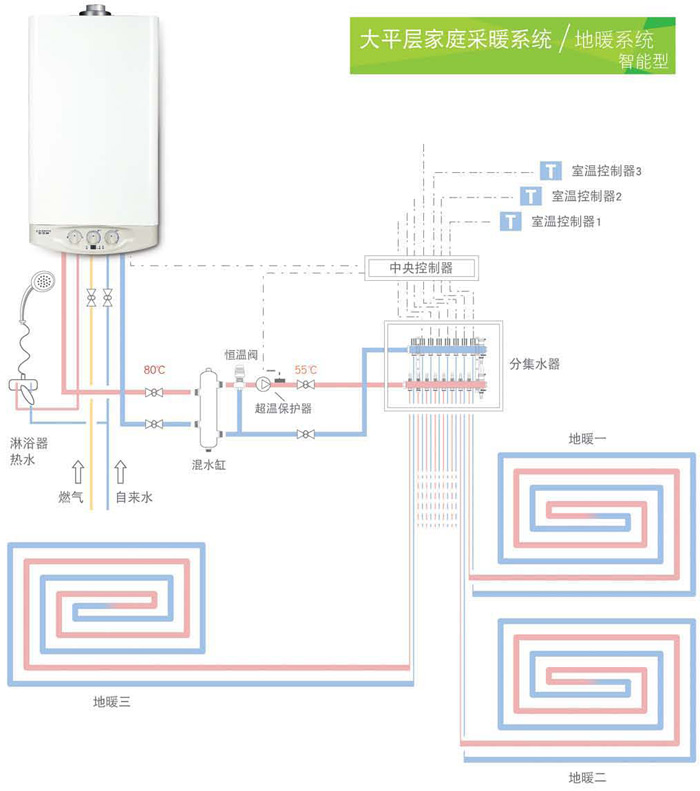 配置地暖中央控制器,使壁掛爐、水泵、溫室聯(lián)動控制,更節(jié)能