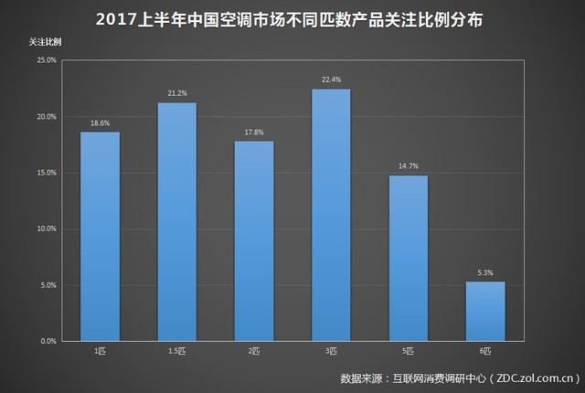 2017年上半年中國(guó)空調(diào)市場(chǎng)不同匹數(shù)產(chǎn)品關(guān)注比例分布